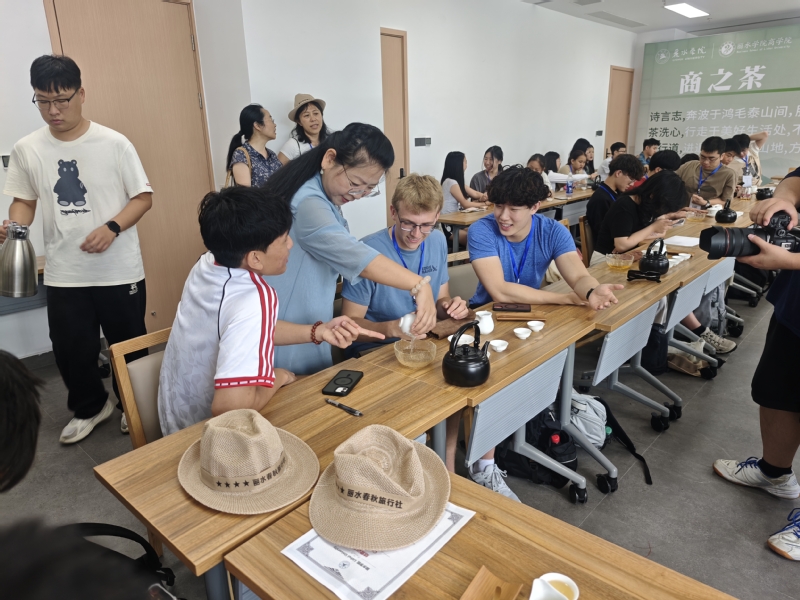 本次活动的茶文化活动分成了四个阶段。由商学院尹隽副教授负责组织和实施。这四个阶段分别是:6月16日上午的茶礼学习和下午带领参观本地优秀现代茶厂,同时进行茶康养体验,调茶和茶康养体验。6月18日随行前往大木山进行采茶制茶体验。6月19日在龙泉上茶街组织品茶活动。