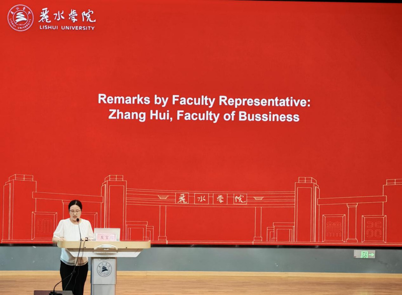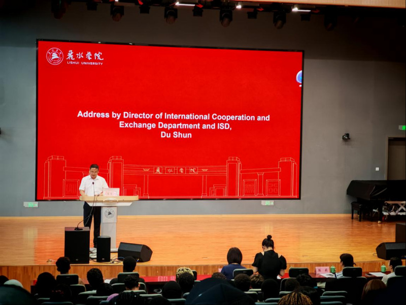 典礼在丽水学院介绍视频中拉开帷幕。视频生动展现了学校悠久的办学历史、优美的校园风光和蓬勃的学术活力,为新生们呈现了一个立体、鲜活的丽水学院。随后,国际合作与交流处负责人在致辞中代表学校向全体新生表示热烈欢迎,并鼓励大家充分利用学校优质资源,勇于探索、跨越文化,努力成为连接中国与世界的友好使者。专业教师代表也寄语新生,希望他们珍惜时光、学有所成。
