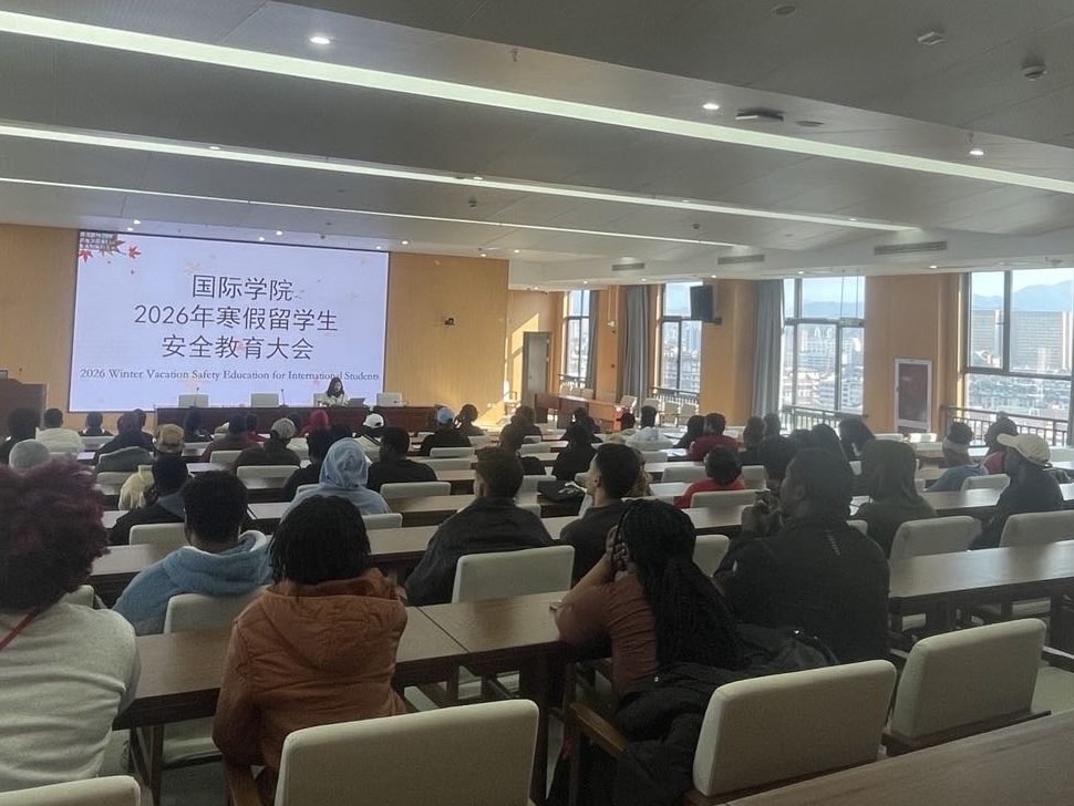 为切实保障留学生寒假期间的人身与财产安全,进一步强化留学生的风险防范意识和应急处置能力,2 月5日,国际学院在崇学楼1118会议室组织召开2026年寒假留学生安全教育大会,全体在校留学生参会。